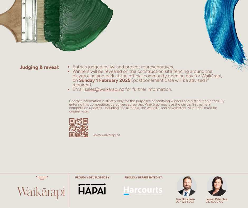 - Winners will be revealed on the construction site fencing around the playground and park at the official community opening day for Waikārapi, on Sunday 1 February 2025 (postponement date will be advised if required).
