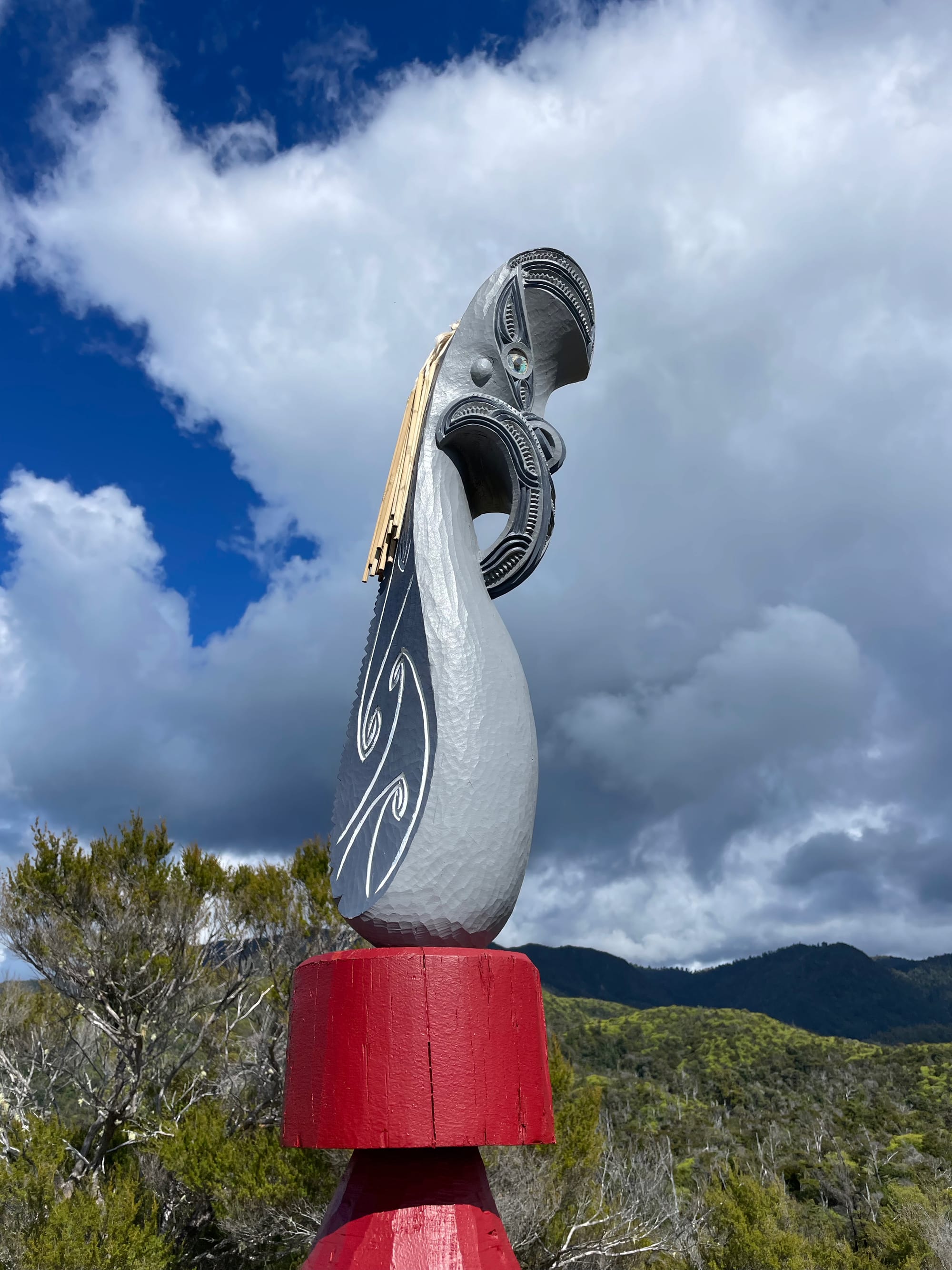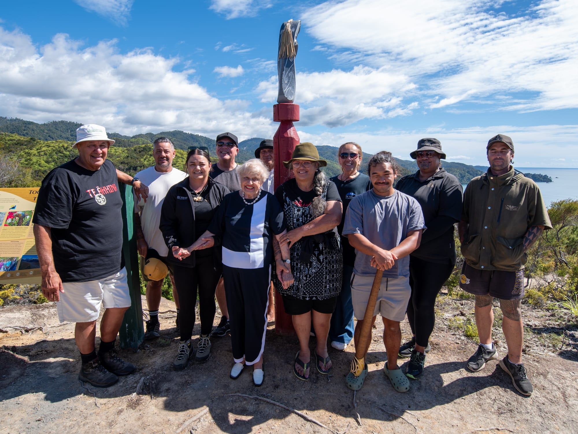 Representatives from Project Janszoon, the NEXT Foundation, the Department of Conservation, Abel Tasman Birdsong Trust, Ngāti Rārua, Ngāti Tama and Te Ātiawa joined the Plowman family at the unveiling of a commemorative sign, seat and wheku (carved post), just off the Abel Tasman Coast Track above Anchorage.