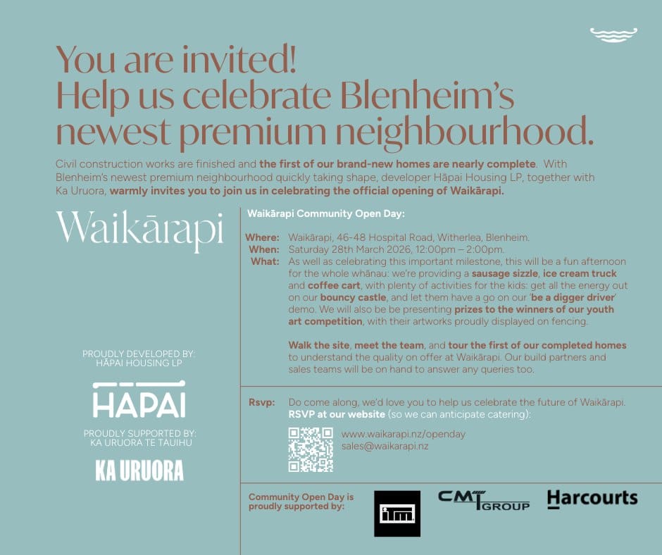 As well as celebrating the first Waikāpari homes being completed, this will be a fun afternoon for the whole whānau: there's a sausage sizzle, ice cream truck and coffee cart, with plenty of activities for the kids: get all the energy out on our bouncy castle, and let them have a go on our ‘be a digger driver’ demo.